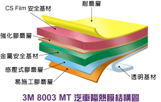 4.感壓式汽車膠:“膠”是所有隔熱紙組成要素裡最重要的一部份,它關乎隔熱紙的裝貼品質、使用年限、視線安全等項 目。3M以黏膠科技聞名全球,並以最穩定、清晰、安全及黏性最佳之黏膠科技應用於隔熱紙上。